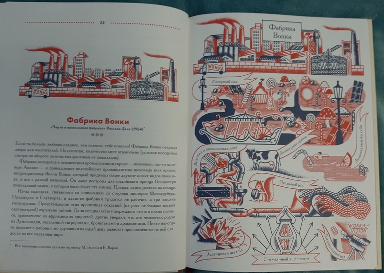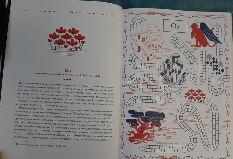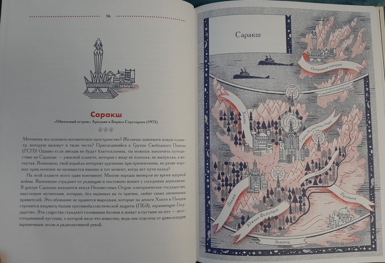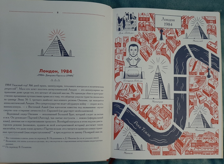 Всего в книге представлено 30 литературных мест, и про каждое есть необычное описание, и действительно больше всего оно напоминает памятку для туриста) С указанием особенностей территории, лучшего маршрута передвижения, главных достопримечательностей и возможных опасностей, и обязательно с картой местности.И при этом в такой необычной манере мы узнаем о чем книга, загораемся ее прочитать, или решаем точно пропустить🙈 я вот все таки не хочу читать 1984 Д. Оруэлла🙈 но зато теперь знаю, откуда пошло понятие Большой брат)