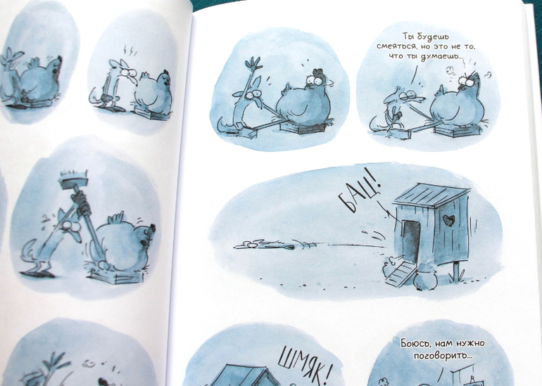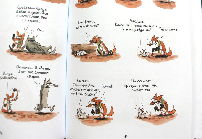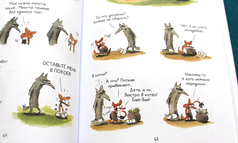 Сама история очень смешная. Шутки на каждой странице, они современные и будут понятны детям. Хочется сравнить книгу с мультсериалом типа «Том и Джерри». Главный герой Лис тот еще неудачник и постоянно вляпывается в нелепые истории. Что уж удивляться, что он стал «мамой» трем зверским цыпляткам.