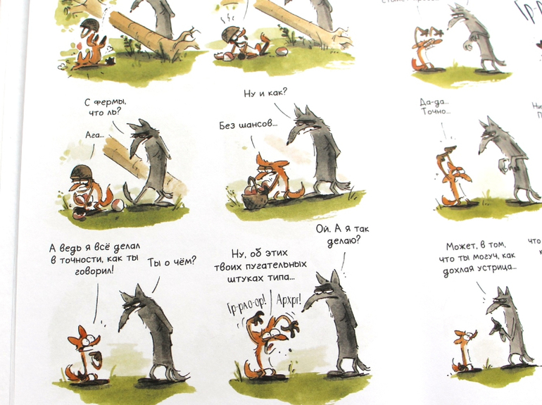 Вся книга это одна история: лис в надежде полакомиться наконец-то мясом постоянно наведывается на ферму, где каждый раз получает нагоняя от грубых куриц. На выходе обитатели фермы подобрее всегда угощают его репой - так уж получается, что она составляет основной рацион горе-охотника. В лесу добрый (но ооочень хитрый волк) дает лису мастер-класс по запугиванию птиц и, поняв, что это бесполезно, предлагает ему самую простую добычу - нет, не репу, а украсть в курятнике яйца. А чтобы с нескольких яиц двоим попировать, надо высидеть с них кур. И покатилось…