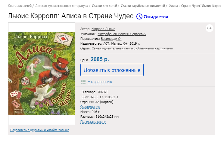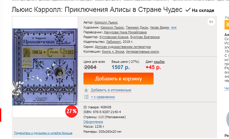 6. Просит Алису в стране чудес. С какого перепугу? У нас дома ее даже нет! Даже муж удивился. Спрашиваю, мультик смотрел? Нет. В садике рассказывали? Нет. В общем не знаю. Со старшей у нас не зашло совсем. Читали тогда простую книжку, с ч/б илл. Теперь склоняюсь к покупке. ВОПРОС № 4. Лабиринтовская интерактивная нам рано, да? Если возьму АСТ-овскую дорогую сейчас, а вторую (если зайдет конечно) летом к 6-летию, нормально будет? На них вообще акции бывают? Или попробовать купить бюджетный вариант пока.