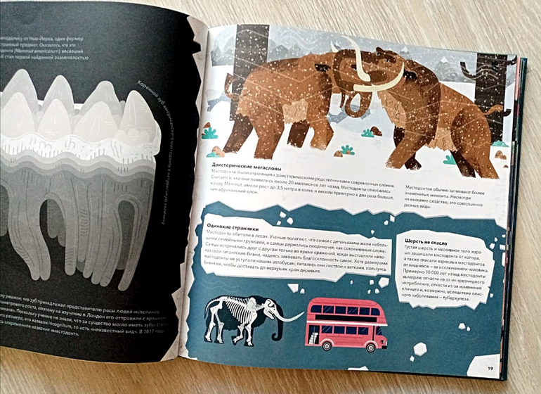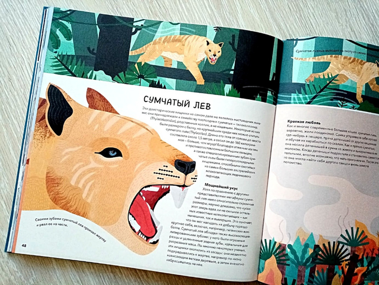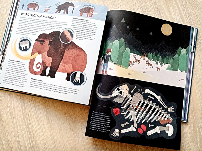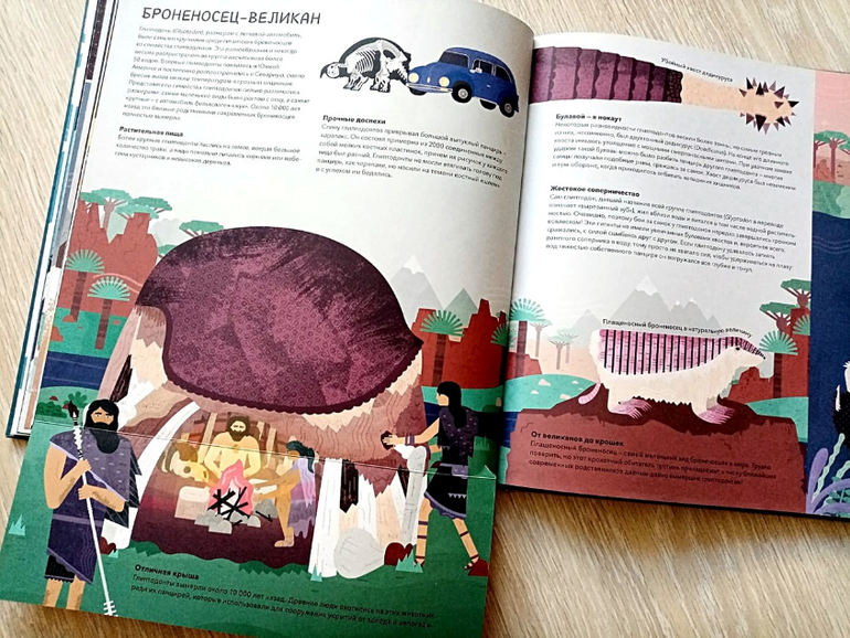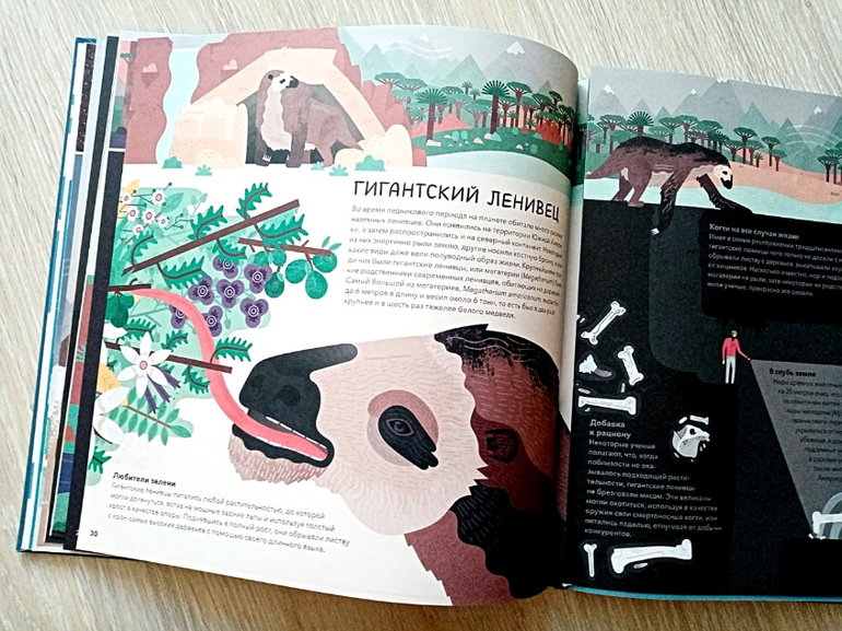 С функцией увлечь двух разнополых и разновозрастных детей эта книга справилась отлично. Она подробно рассказывает о гигантских животных, населявших нашу планету тысячи лет назад.