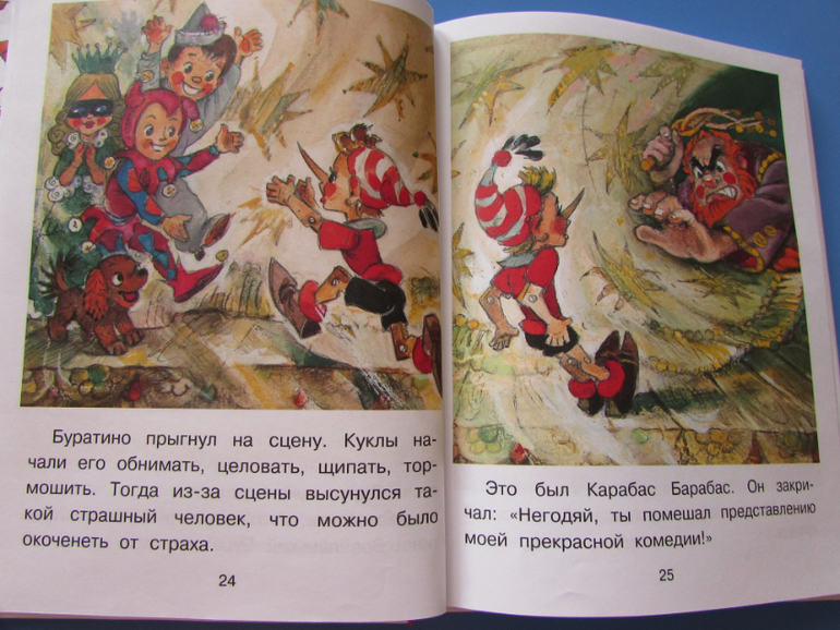 В данном случае я купила сокращённый вариант сказки о Буратино созданный Алексеем Толстым для малышей. Книжка - картинка, с минимумом текста и с большим количеством картинок.