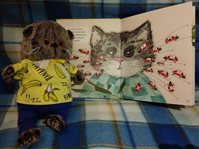 Как вы думаете, что это за букашки с номерами на спинках ползают по усам серого котейки, нарисованного на обложке? Оказывается, "это ж-ж-ж неспроста!" Букашки подсказывают юным читателям, что у котов по 12 усов с каждой стороны. Их даже можно пересчитать и проверить этот неоспоримый факт!
