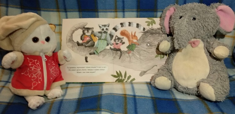 Зато коты могут пить соленую морскую воду и легко могут прыгнуть на высоту, равную пяти кошкам. А еще "Котик умеет говорить сто разных МЯУ, а собака только десять разных ГАВ." Есть в этой книге про котов даже наш любимый слон! И, оказывается, слоны тоже умеют мяукать, как кошки, белки и лемуры.
