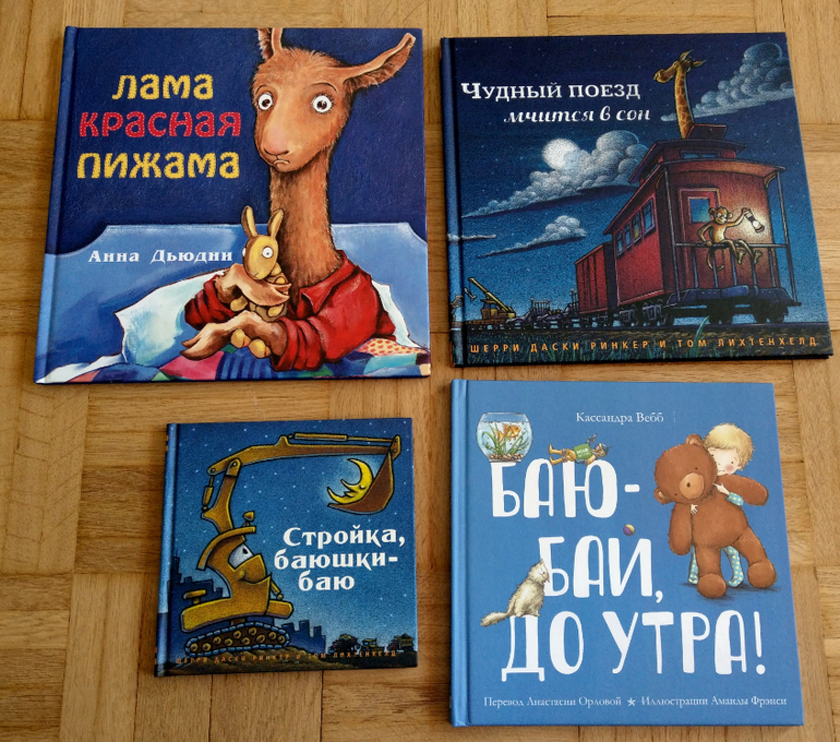 Если укладываю спать я, то мы читаем в основном эти четыре. Причем Баю-бай до утра самая-пресамая любимая😍, и для меня в том числе. Чудный поезд мне не очень нравится, вот вроде красивая, и идея классная, а не идет мне и всё.