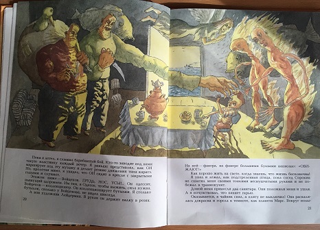 В общем, книга не наша от слова совсем. Она как бы не детская даже... Мои дети повергнуты в шок желанием учителя жить с семьей мальчика, этакой семьей с одной мамой и двумя папами, и еще историей про то, как папа ушел к другой, но вернулся только из-за увядшего от тоски цветка... Я конечно пыталась девчонкам своим объяснить, что это такой юмор, сатира, гротеск.. Но я, честно, говоря, тоже в легком шоке от историй... Прочитали мы 3 истории, как те мышки, которые плакали, кололись, но продолжали есть кактус - все ждали чего-то хорошего... Но в начале четвертой истории иллюстрация нас просто заставила захлопнуть книгу. (иллюстрация ниже). В общем, мы не прониклись...