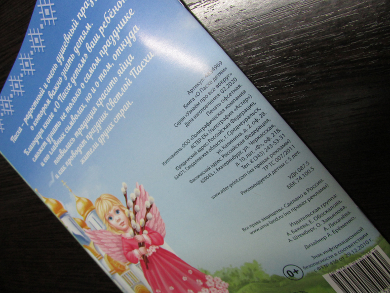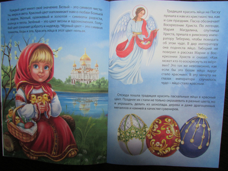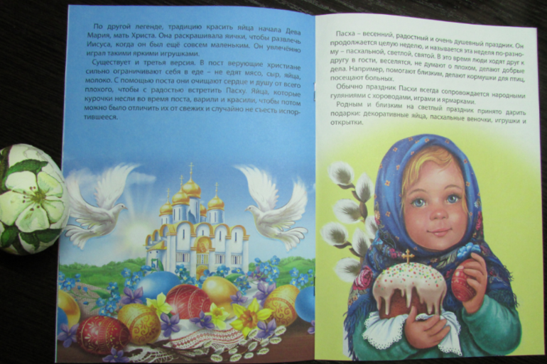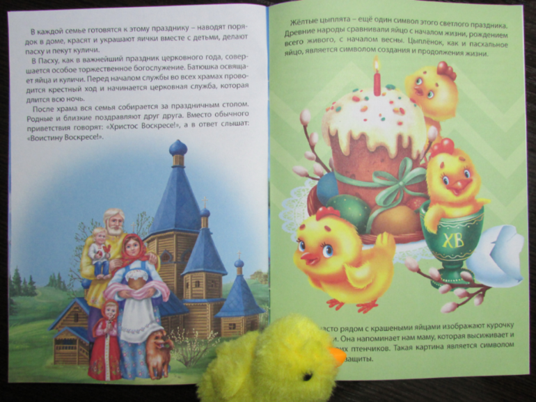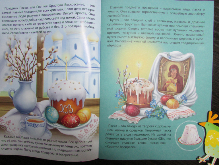 Тонкая гладенькая обложка, яркие иллюстрации для детишек и понятное повествование о Пасхе.