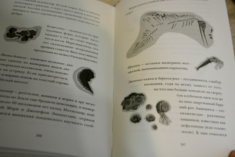 Но в книге не много описаний каких то палеонтологических находок, эта книга больше о жизни, о взрослении Мэри Эннинг, о необразованной девочке-из очень бедной семьи (такой бедной, что у них иногда даже еды не было). О том, как Мэри начала увлекаться поиском окаменелостей (с лёгкой руки отца). Поначалу, это было лишь средство заработать на жизнь, продавая найденные окаменелости богатым людям, Мэри даже названий их точных не знала, и к примеру называла аммониты то "змейками", то "бараньим рогом". Постепенно её увлечение перерастает в нечто большее, она начинает более подробно изучать анатомию, строение костей животных и пытаться разобраться во всех этих окаменелостях и останках. Т.е. она фактически самоучка, у которой даже нет возможности где-то почерпнуть информацию, а ещё, она постоянно рискует своей жизнью, что бы добраться до своих находок.