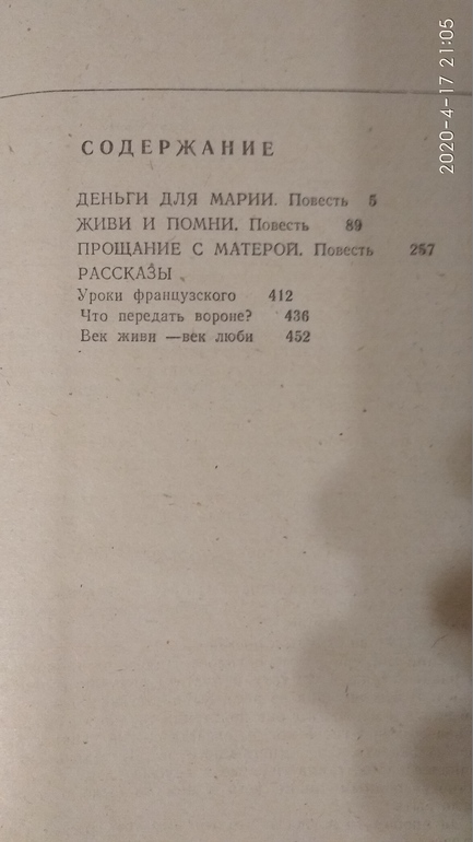 У него удивительные книги, такие проникновенные. Наверно, самое сильное - это Живи и помни. Вряд ли смогу его перечитать, кажется, что крик «Настёна, не смей!», будет преследовать меня с первых строчек. И ведь наш край описывается. А прощание с Матёрой… А его Уроки французского... Удивительный писатель! Хотелось бы, конечно, другую книгу с его произведениями. Так как здесь бумага желтая, шрифт очень мелкий. А эти книги достойны другого исполнения.