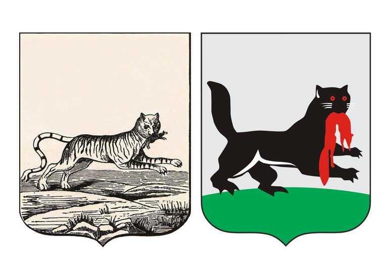Ведь на самом деле бабр - это не мифическое животное, а большой тигр, который водился в нашей местности. И на гербе города был изображен тигр (бабр), несущий в зубах соболя (картинка слева). Но, вспоминаются слова Заходера - «в этой сказки нет порядка, здесь ошибка, опечатка». Вот из-за такой опечатки-ошибки, тигр приобрёл черты бобра и превратился в такой уже необыкновенное животное (картинка справа, вот такой у нас герб).