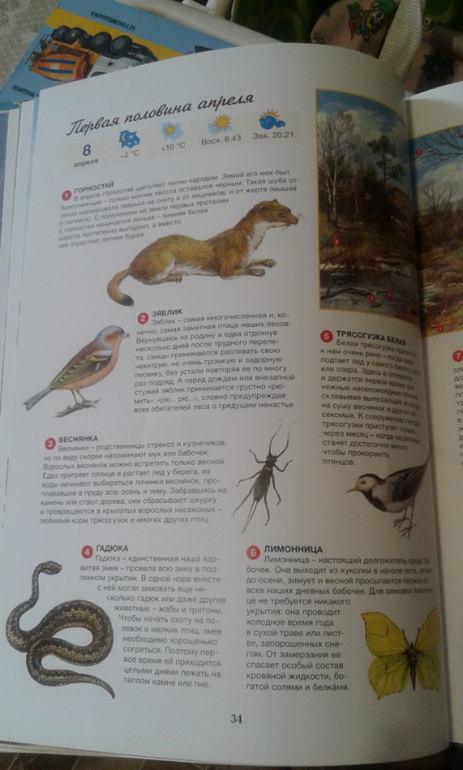 Вся флора и фауна по месяцам. На каждую половину месяца красочный разворот. А после него описание животных и растений с картинками. Изучив картинки и описание, возвращаемся на разворот и находим там уменьшенные копии! Читать и смотреть можно бесконечно!