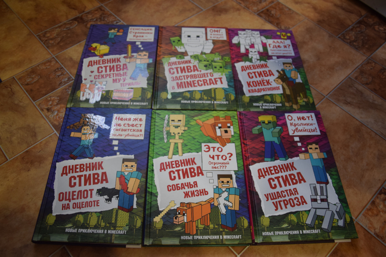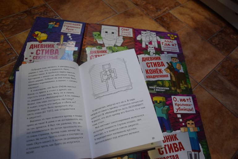 Дима прочитал первые 6 книг. (их вроде 14).Всем мальчишкам известны герои мегапопулярной игры «Майнкрафт». В этих книгах рассказывается о приключениях Стива.Стив был обычным школьником, но теперь он часть игры, и ему приходится учиться выживать в странном квадратном мире "Майнкрафта". То он собирается устроить суперскачки на лошадях, то пытается подружиться с жадным волком, то он находит дома в форме животных, в которых оказываются ловушки. Невероятные приключения в пещере, сражения с мобами, встреча с кроликами-убийцами. И только он находит нужную страницу, на самом интересном месте она обрывается. Юмор, шутки. Всё в стиле «Майнкрафт".