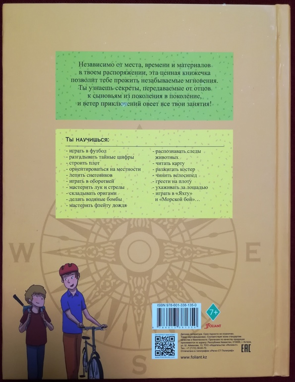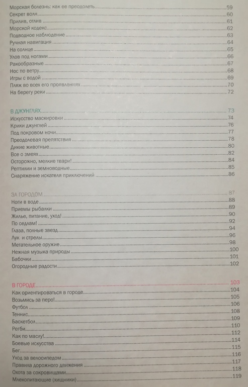 Недавно я приобрела книгу "Как подготовиться к приключениям", она с 7-ми лет. Без особых подробностей и объяснений, но некоторые основы для разных ситуаций даны. В книгу интегрирован компас (лучше бы не было - он не работает судя по комментариям у многих, в т.ч. и у нас), страницы прямо ооочень плотные. Каждая тема на 1-2-3 страницах, чем-то похоже на презентацию. Я подробно ещё не читала, сейчас посмотрела пару тем. Есть вещи, с которыми я не соглашусь (техника плавания брасом, например), есть способы, которые показаны хорошо для запоминания, но не объяснён смысл (морской узел "булинь"), есть нечёткие описания (цветовой код в морском кодексе описан "в порту", а по правде это при заходе в порт, да и то далеко не "всегда" - за океаном наоборот)... В общем, для ознакомления, что есть такое, годится, а вот детали уточнять придётся самим.