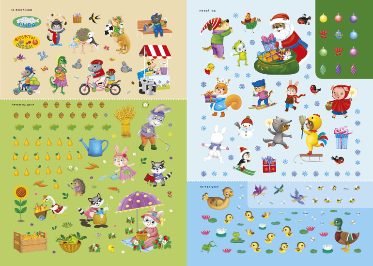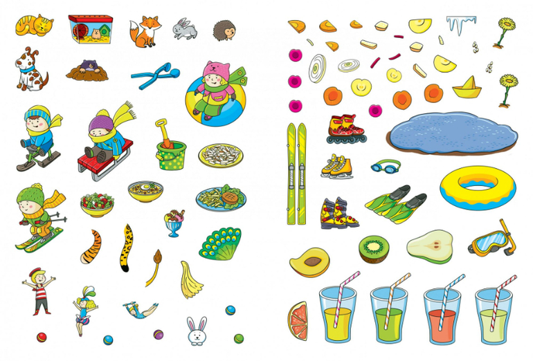Наряжая персонажей книжек при помощи наклеек, ребёнок знакомится с профессиями, временами года и погодой, учится логически мыслить и тренирует мелкую моторику.