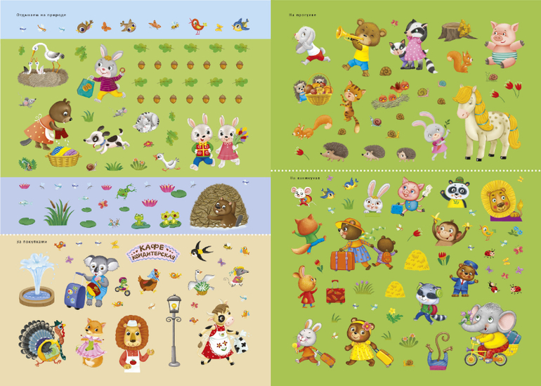 В ней вы найдёте 11 ярких тематических фонов о жизни и приключениях весёлых зверят на природе и в парке развлечений, в доме и на даче, на море и в лесной школе и т.д., более 600 красочных наклеек, которые помогут ребёнку создавать собственные картины и познакомят с весёлыми зверятами.