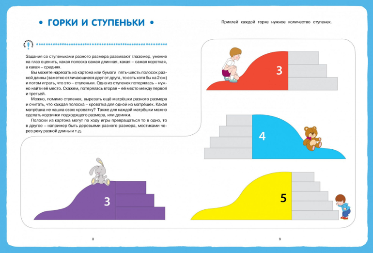 - Занятия по этой книге помогут развить логику, мелкую моторику, память, внимание, пространственное мышление, а также навыки счета от 1 до 5.