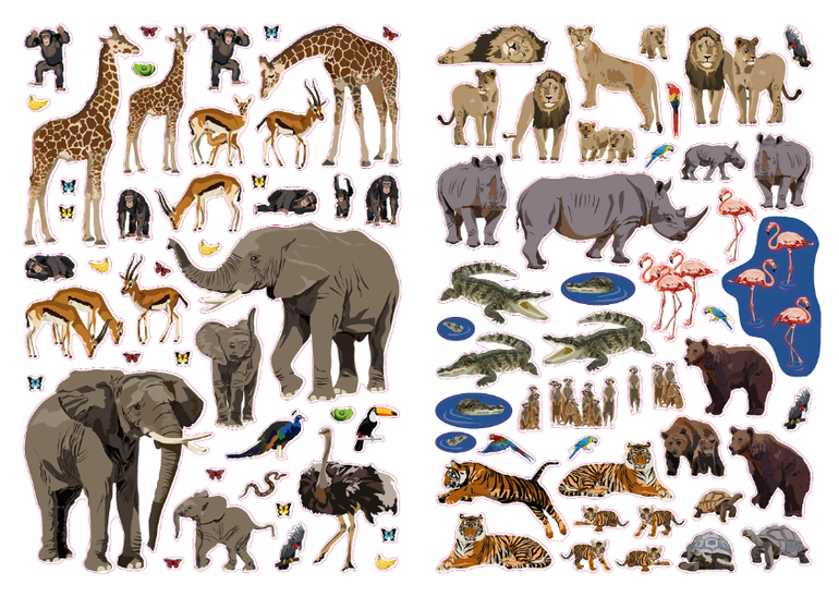 Более 400 наклеек с изображениями животных и красочные страницы с фонами для заполнения.
