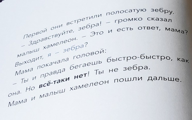 Кажется, я становлюсь поклонником минимализма ) Ничего лишнего, никакого отвлекающего фона, ведь вопрос малыша так важен! Все внимание сконцентрировано только на поиске ответа, никаких отвлекающих деталей, даже фона нет. Как же прекрасно дышится на свободных белоснежных страницах! Как точно и тонко, я бы сказала скрупулезно, прорисованы фигуры животных! Как верно найдены приметы, черты для подражания! Малыш-хамелеон гениально выхватывает один из признаков, копируя его в дополнение расцветки то позой, то изгибами хвоста.
