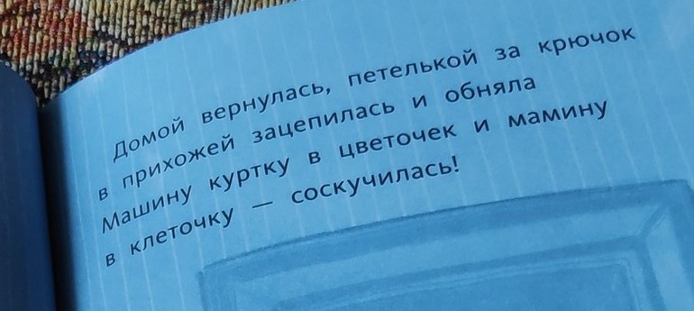 Дети ведь слушатели дотошные. Им надо, чтоб все было "как написано". Написано-то "петелькой за крючок зацепилась и обняла Машину и мамину куртку". А не повисла на плечиках "слегка соприкоснувшись рукавами".