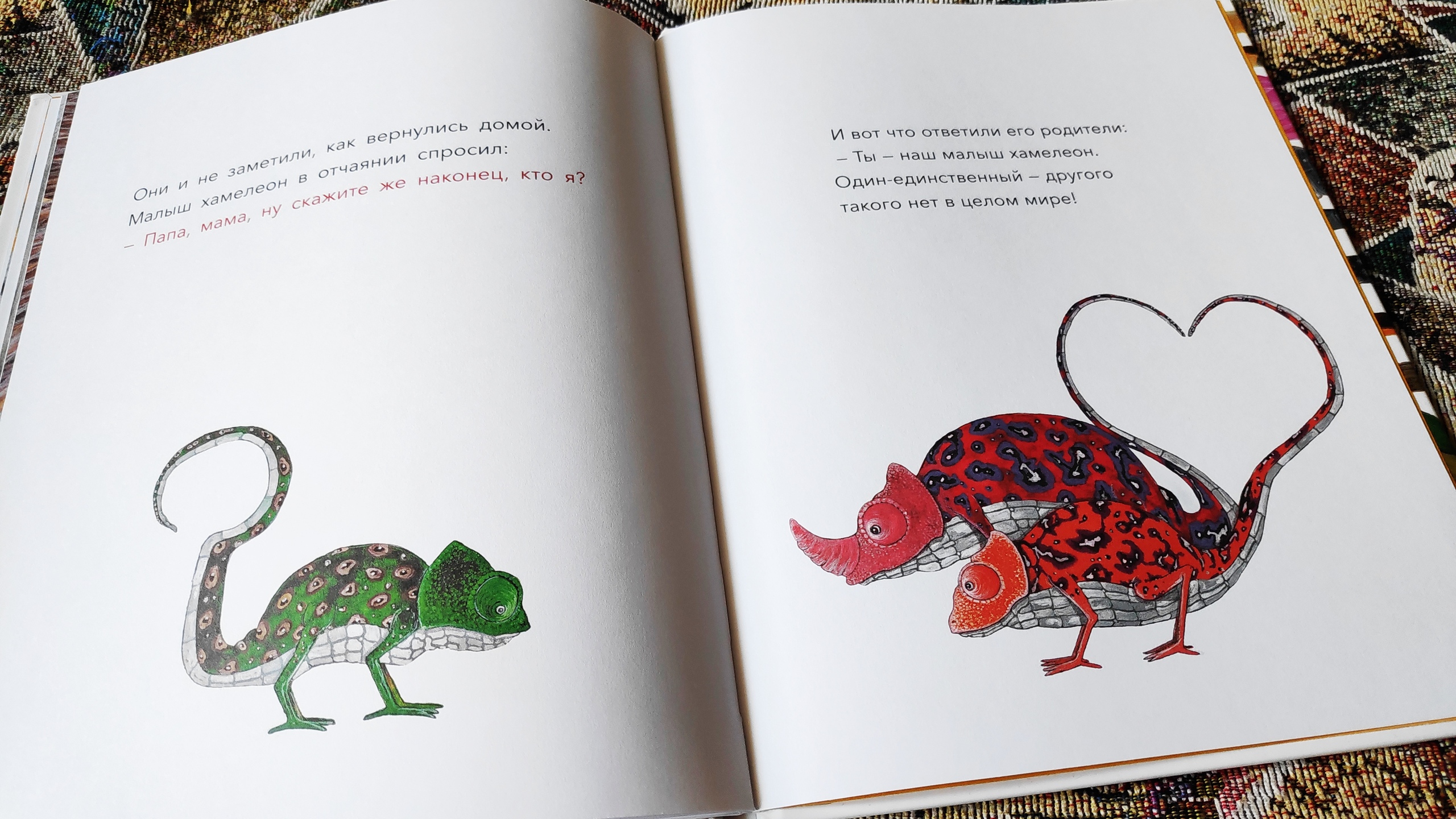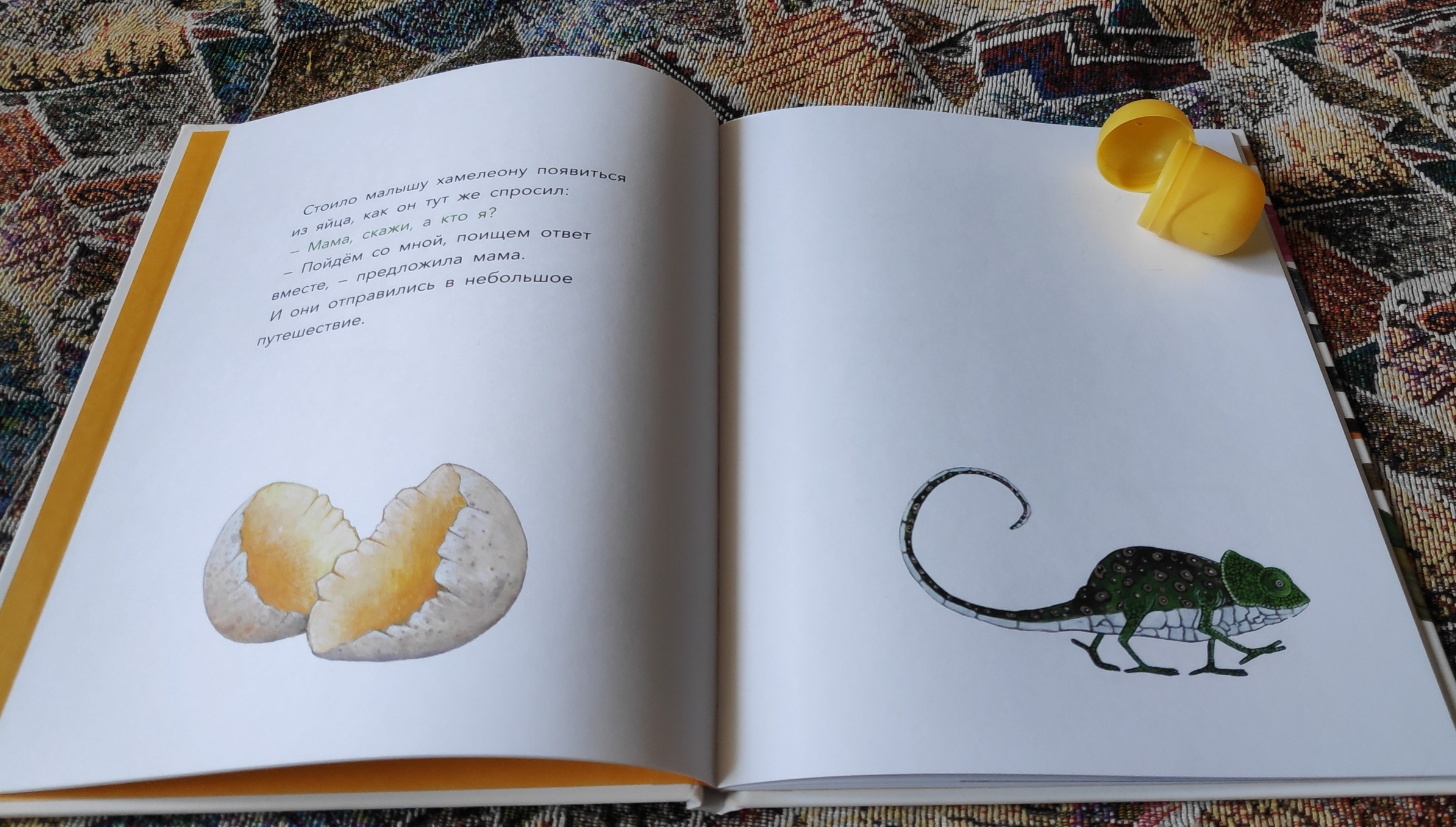 Ведь в ней малыш хамелеон только появляется на свет, с любопытством осматривается вокруг и спрашивает у мамы - кто я?