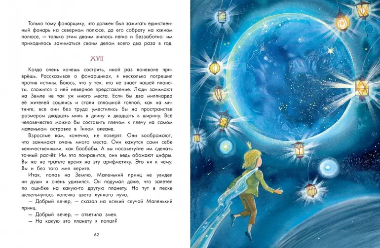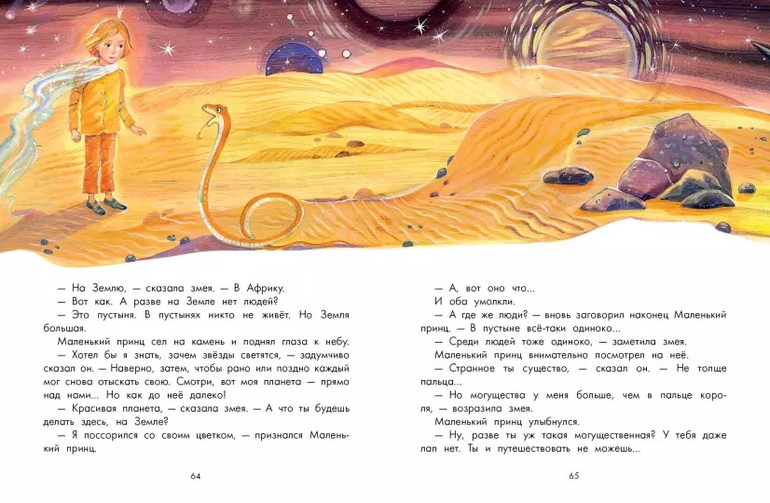 "Маленький принц" - эту притчу Экзюпери знают все. Но перечитывать ее можно много раз и в любом возрасте. И всегда вы найдете там что-то свое. Малыш влюбится в преданного лиса, взрослого растрогает история любви к розе, в мудром возрасте вздохнешь над сценой прощания и светлом финале… Нарисовала этого маленького принца - наивного, светлого мальчишку, немножко неземного - талантливая художница Светлана Емельянова. В рисунках видны и ее добрый характер и юмор - лентяй на баобабах, король без подданных - эти иллюстрации сразу западают в память. Но больше всего запоминается образ звездного мальчика…