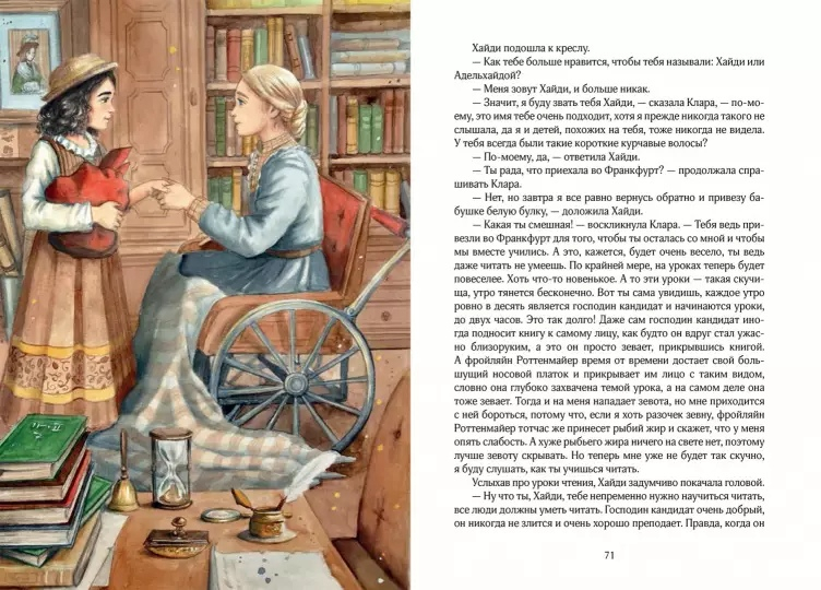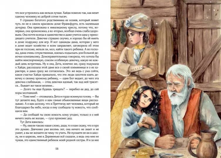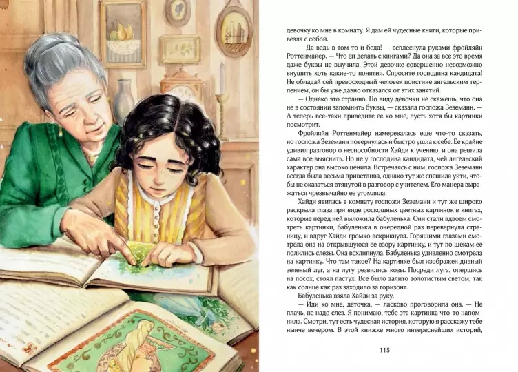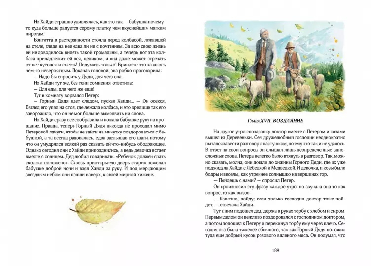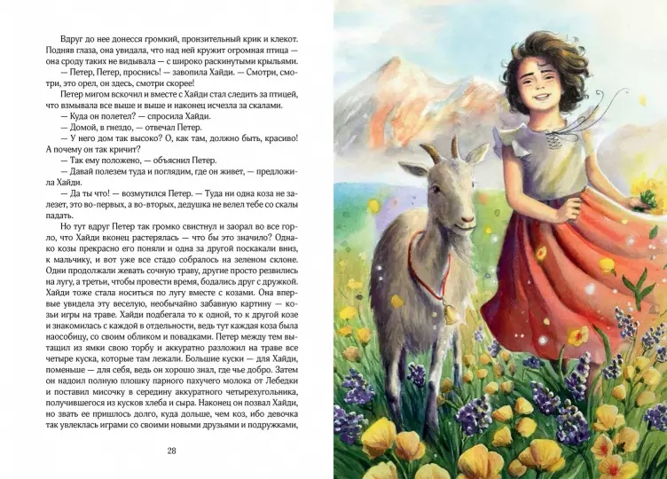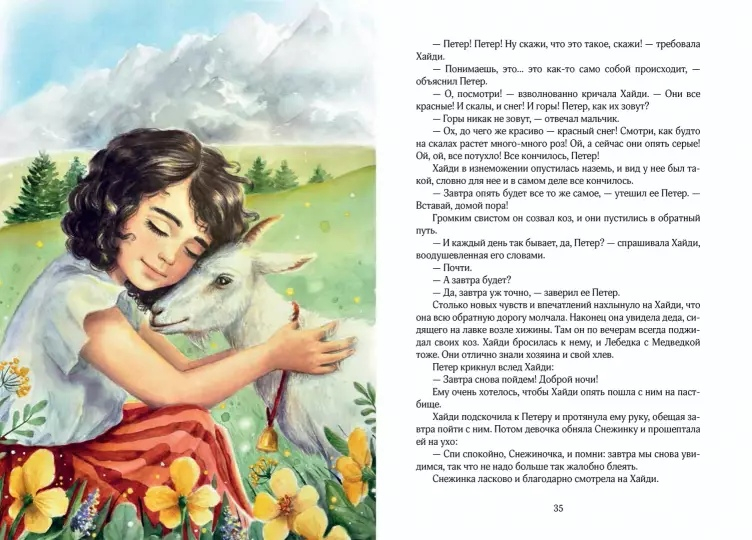 Хайди - открытая душа. Она готова любить всё и всех: сурового Горного Деда, мальчишку Петера, коз, горы, одинокого доктора, старенькую бабушку, больную подружку... Единственное, что может ее опечалить и заставить погаснуть звезды в глазах - это несвобода. Комфортная клетка городской жизни не для нее. Хайди - светлое, веселое, чистое и очень деятельное создание, которое приносит радость в жизнь всех, с кем встречается. Так как же жилось маленькой девочке в огромных горах?