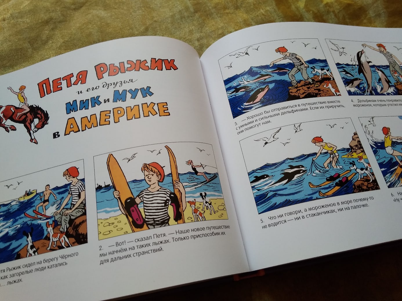 Петю Рыжика можно назвать советским комиксом. Но по-моему, ему больше подходит название "книжка-картинка" и сама книга больше похожа на раскадровку диафильма. Восемь чумовых приключенческих историй в одной книге. Петя побывал не только в Африке, Америке и на Северном полюсе, но вместе со своими собаками Миком и Муком добрался даже до Луны. Рассказы неправдоподобные, гротескные, из разряда "небывальщин", ура-ура-героические, словно Петя на ходу сочиняет свои истории, бахвалясь перед друзьями во дворе. Легкое приключенческо-завлекательное чтиво, раньше печатавшееся в журналах. С каким нетерпением все ждали продолжений этих историй в картинках!