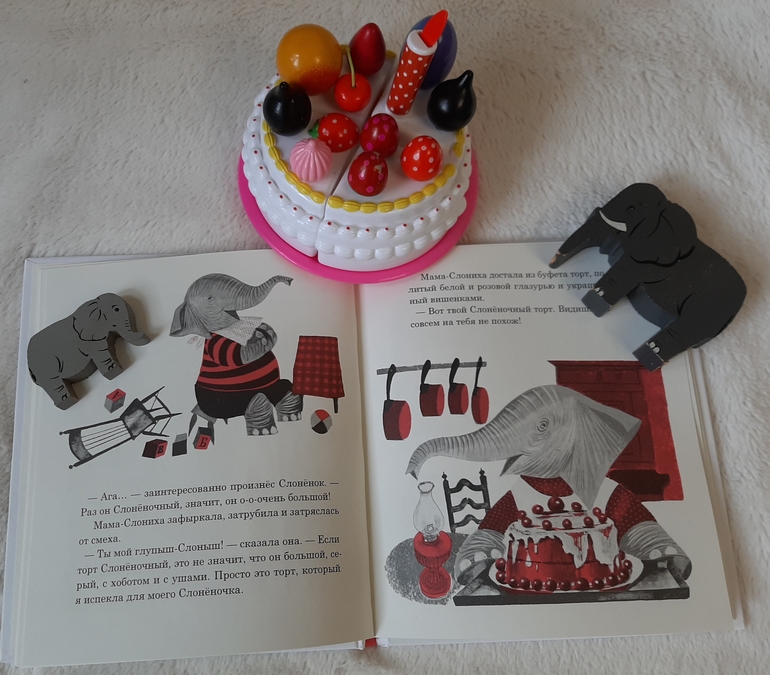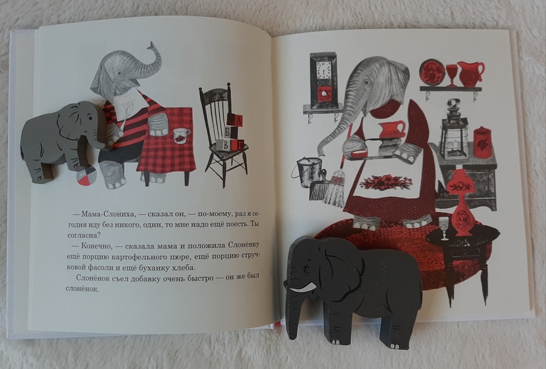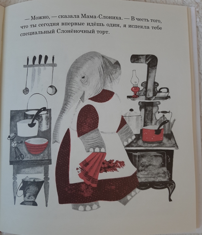 И мы сразу влюбились в книгу, в историю, в чудесную маму Слонихочку и в милого, обаятельного Слоненка! Поэтому и от покупки второй книги, которая на самом деле первая, я конечно, не удержалась) Эти книги дарят удивительное чувство теплоты, душевности и нежности! С таким удовольствием следишь за взаимотношениями взрослых слонов- родителей и маленького слоненка- ребенка! Каким пониманием, принятием и любовью они наполнены! Поддержка, похвала, нужные слова в нужный момент! И много еды, если нужно))