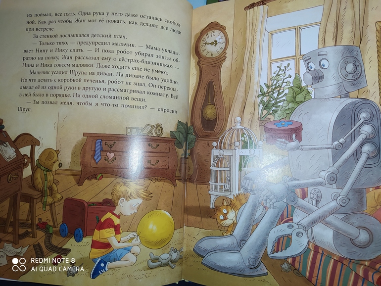Про робота довольно странная книга. Мальчик пришел к роботу, который чинил все вещи в городке, и попросил его" починить" маму. Мама погрязла в быту, стала неласковая, невнимательная, растерянная. Оказалось, что у нее родился второй ребенок и мама растерялась, не знала за что хвататься. Робот изучил множество энциклопедий, пособий, пронаблюдал за другими мамами. В итоге он организовал всю семью на помощь маме, вызвал бабушку сидеть с детьми, сделал ей прическу, сшил платье и отправил с папой в кино и ресторан. Не знаю в каком возрасте ее читать. Варя совсем не поняла, про что книга. Сказала - про робота. Ей понравился вам робот. Иллюстрации красочные, из очень много. Еще у робота - шесть рук)) Не уверена, что мы ее будем перечитыват.