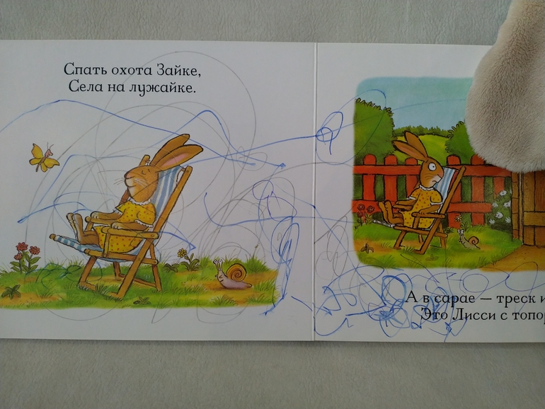 У "Зайки-зевайки" дочка как-то оторвала-таки окошко, которое изображало дверь в шкаф. Я подрисовала аккуратно, подмазала часть клеем и приклеила скотчем. Через некоторое время опять доча оторвала, я снова приклеила. Потом приносит мне книжку и это злополучное окошко отдельно. Я у неё на глазах приклеила с причитаниями: "Ай-ай, книжечке больно, я её полечу". А она взяла готовую, ушла, и через 2 минуты снова приносит книжку отдельно, окошко отдельно... Я больше не стала приклеивать, хватит. Так она в другой книжке начала окошки отдирать, благо та ещё у старшей для отдирания задумана была. Подкопно-погрызная деятельность у нас ярко выражена у всех, у младшей даже ярче.