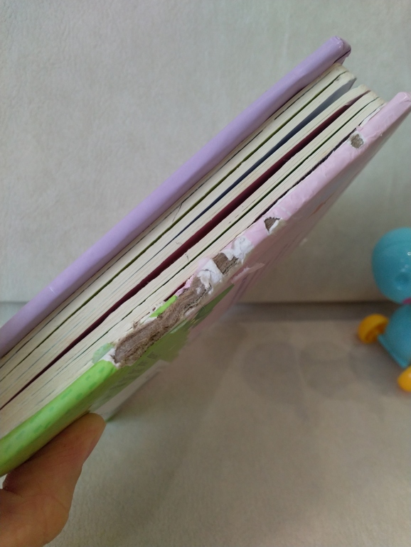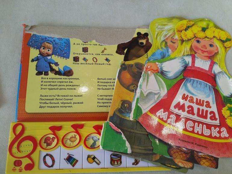 Страдают в основном музыкальные картонки - от них остаётся только задняя часть... Эти на фото я уже клеила-попереклеивала. Чебурашке из "поющих" носков повезло меньше, он был одним из первых порванных, у него только эту поющую основу оставили. Ещё были книжки-малышки пазлами, они вообще на отдельные листы-картонки распались, везде валялись, я всё и повыбрасывала. Даже фото тогда сделала того, что ещё нашла.