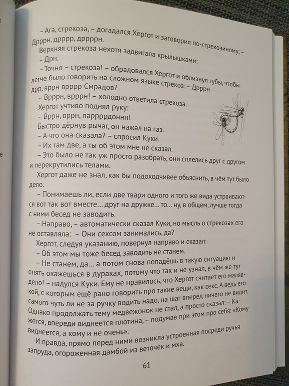 Вот вроде всё неплохо в книге, столько интересных вымышленных героев,иллюстрации так вообще прекрасные, они отлично вытягивают, на мой взгляд, немного затянутый текст. Даже сцена со стрекозами меня не смутила, не увидела там ничего крамольного. Видимо слово "секс" в тексте сильно смутило многих читателей-родителей. Но я думаю, что просто эту книгу не стоит слишком рано читать ребенку, чтобы не было недоразумения с лишними вопросами или просто изменить это слово на "любовь", "влюбляются","целуются" например. У нас ведь как в стране? Родители делятся на два лагеря: есть те кто за сексуальное просвещение детей и те, кто с советских времен делает вид, как и его родители ранее, что секса нет)))). Я скорее тоже со второго лагеря)). Книгу эту в ближайшее время не планирую Ильдару читать, отложу на годик-два и может даже оставлю на полное самостоятельное чтение.