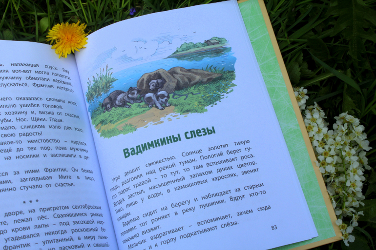 младшим школьникамЕздили на дачу. Хорошо, тепло, солнышко припекает. Бабушка заварила нам чай с мятой и молодыми листочками смородины. Какое наслаждение пить ароматный чай в беседке и разговаривать, или читать. Настя привезла с собой две книги о собаках. Это ее давняя заветная мечта, больная тема. Сколько слёз пролито, но я остаюсь непреклонна. Трудно быть родителем, тяжело отказывать ребёнку, да и собак я очень люблю. Сама бы завела сразу несколько, если бы жили в своем доме, а не на съемной квартире. А так, приходится быть жестокосердной. Знаю, что книги про собак и кошек читаются просто моментально, поэтому стараюсь не пропускать такие новинки. Эти книги Настя сама увидела в магазине и сказала, что они ей очень-очень нужны. А я только за.)) В итоге обе книги прочитала за один день, в начале мая, но на дачу тоже их захотела взять. Оказывается, решила почитать их своему двоюродному брату.))) Этот красавчик задарил меня букетами из мать-и-мачехи.))) Потом я решила сфотографировать книги, чтобы написать отзыв, а он мне помогал с большим удовольствием, раскладывал цветочки вокруг книг))
