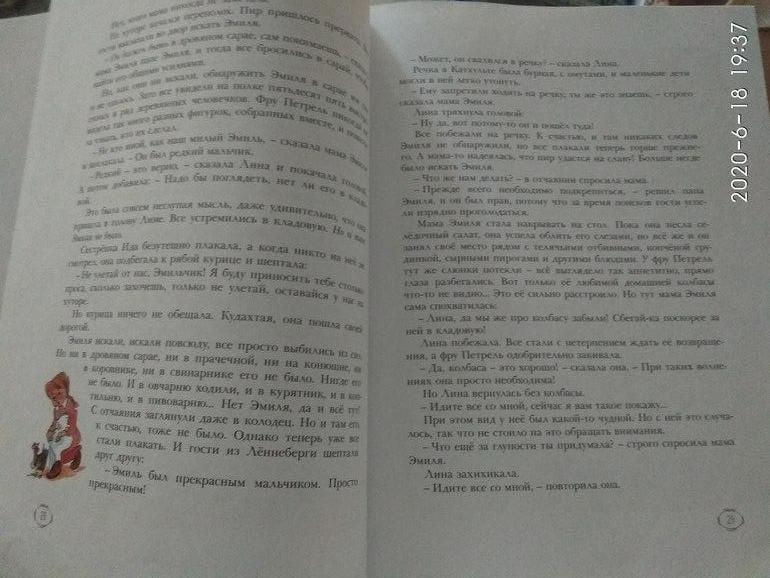 Вот это я первую главу Вам сфотографировала. Часто на разворот (а книга достаточно большого формата) идёт только текст. Или вот такие маленькие картинки Вот таких больших мало. Я когда читала сыну сама он был уже большой и ему картинки были не важны. Сейчас читает сам и ему, конечно, важнее текст. Хоть и иллюстрации естественно любит.