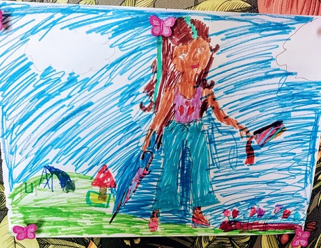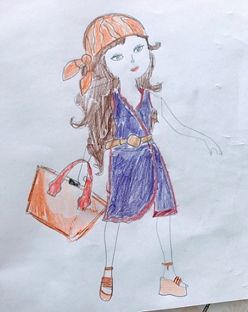 Моя Юля долго самозабвенно корпела над прорисовкой деталей, но потом пришёл фломастер... Дочь все-равно довольна результатом. Радужные аксы, зелёные пряди и джинсы- такой видит она свой идеальный образ.
