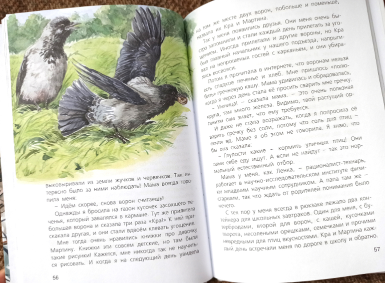 Вторая повесть другая. Здесь героиня пятиклассница, она любит биологию и животных, она много наблюдает за птицами, а особенно за вороньим семейством, живущим во дворе. А читатель наблюдает еще за ее жизнью семейной и школьной, где такая трудная математика.