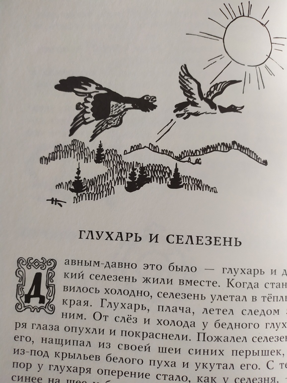 Что касается рисунков, их около 18, есть в каждой сказке, два больших на весь лист. Они черно-белые, есть один разворот наполовину цветной, в начале книги.