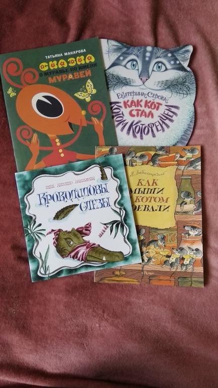 Семь разноцветных сказок - очень простая книжка о девочке в разных передниках. Но в каждой сказке есть рассказ или о цветах, о лякушке, стрекозе, ягодках, деревьях. Они спокойные. Но Тёма с первого раза их полюбил, прочитали уже огромное количество раз! Формат большой и интересный, но у нас вылетом листы прям в первый же день (((
