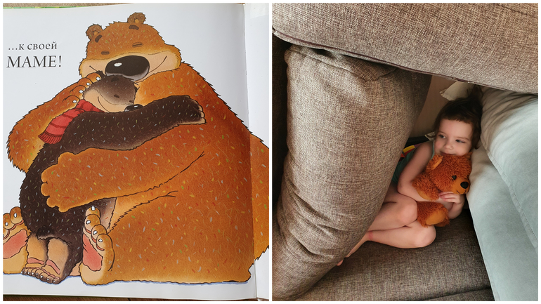 Дочь пообнималась с холодильником, шкафом и стульями. Потом соорудила берлогу и обнималась там с плюшевым мишкой (я тактично отказалась от роли медведицы, уж очень жарко в берлоге в такую погоду). Потом они с медвежонком принимали в берлоге гостей, устраивали чаепитие, ходили на прогулку и даже, кажется, кого-то лечили.