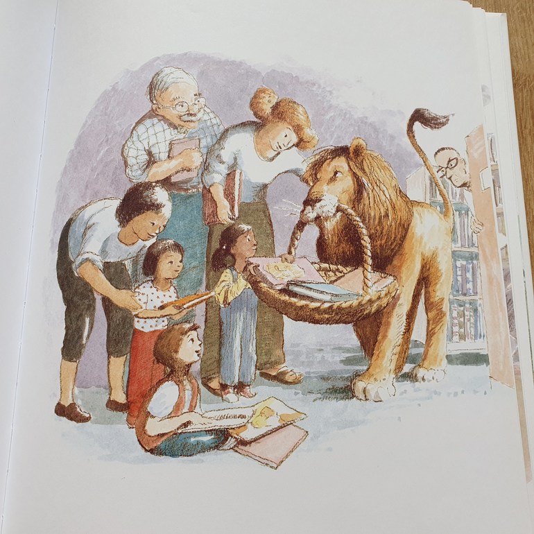 И закончили "Львом в библиотеке" Мишель Кнудсен. Очень кстати, игра в библиотеку - отличный повод расставить все книги по местам перед тем, как ложиться спать. Книга философская, об отношении к правилам и ситуациях, когда правила нужно нарушать. До того, чтобы понять всю глубину смысла этой истории, дочка ещё не доросла, обязательно будем возвращаться к книге позже.