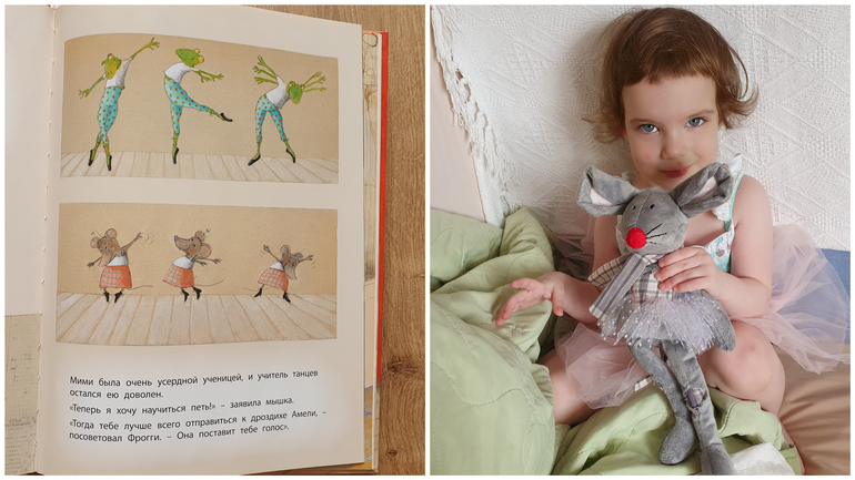 Потом читали "Мими-балерину" Хельги Бланш. Дочка наряжалась сама, наряжала мышь и танцевали под музыку ночника-проектора.
