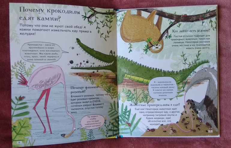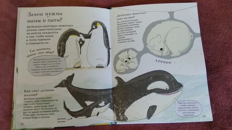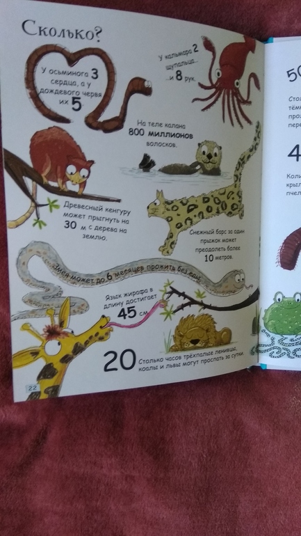 Очень много интересных фактов - змея может не есть 6 месяцев, а кенгуру прыгает вверх на три метра! Естественно Тёма прыгал на диване и кричал, что он выше)))