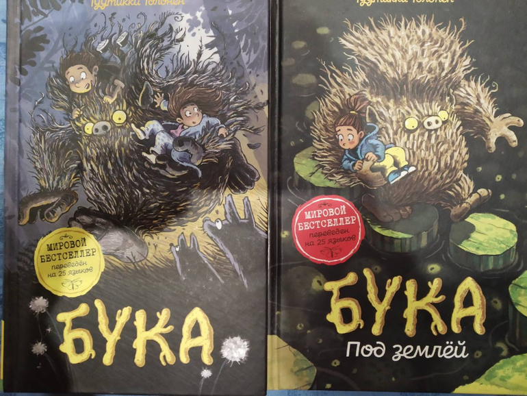 "Бука" Толонен, История из жизни скандинавского автора, папа в командировке, маму куда-то вызвали, трое детей остались одни дома, но на помощь была прислана необычная няня по имени Бука, немного пахнущая болотом)) да так необычно и по скандинавски начинается эта книга, Оказалось, что из деревни под разными предлогами исчезли все взрослые , и у всех детей были эти Буки, дети наслаждались свободной жизнью)) Первая часть книги мне понравилась больше, она про реальную жизнь с Букой, во второй части началось конкретное фэнтези, дети ушли с Букой под землю, то ли спасать, то ли помогать. Мое дочери книги понравились, очень милые рисунки, в первой книге их больше. Немного даже читала сама.