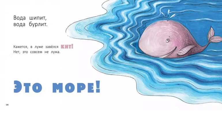 - Вместе с книгой ребёнок сможет рассматривать картинки, изучать разные величины, сравнивать, что больше, что меньше, и, конечно, повеселиться, когда, к примеру, из лужи выпрыгнет кит.