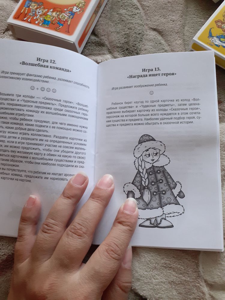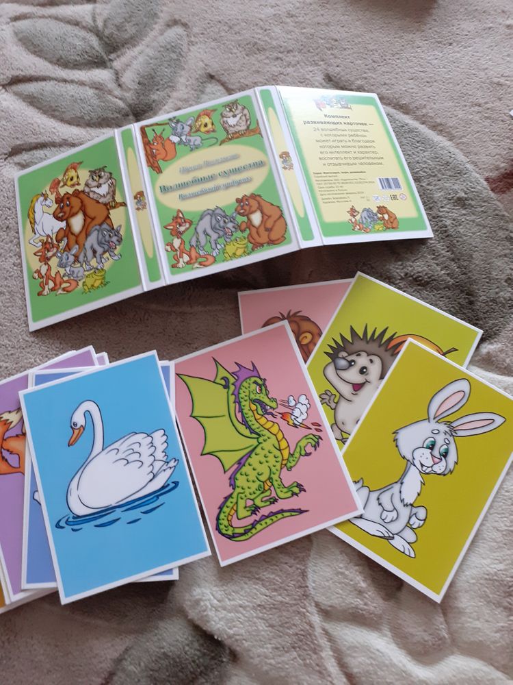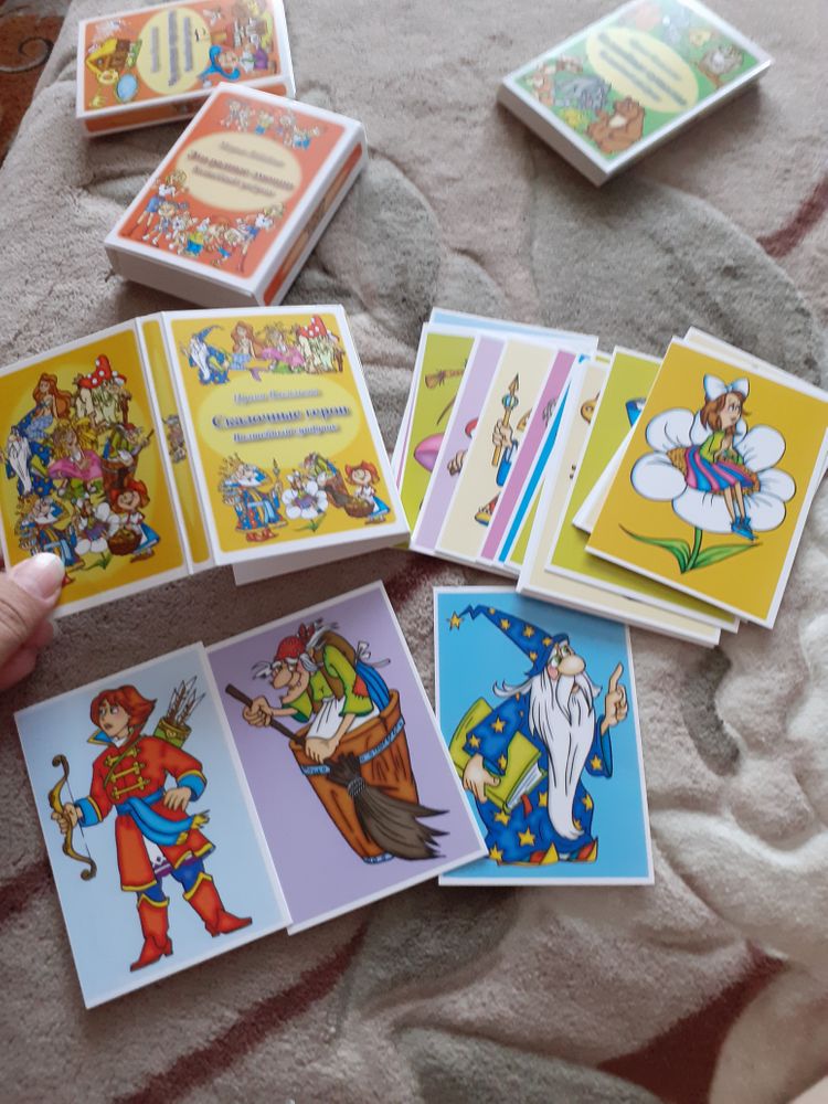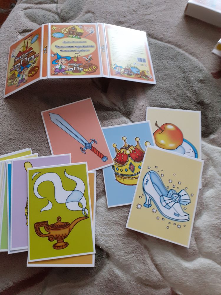В общем, сначала мы поиграли по простому: показывала ребенку картинку, а он называл мне что или кто это. Потом поиграли в игру с колодой про сказочных героев. Нужно было сказать что это за герой, положительный или отрицательный, какие у него качества.