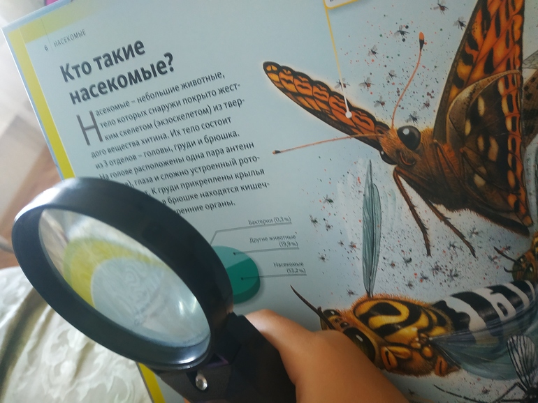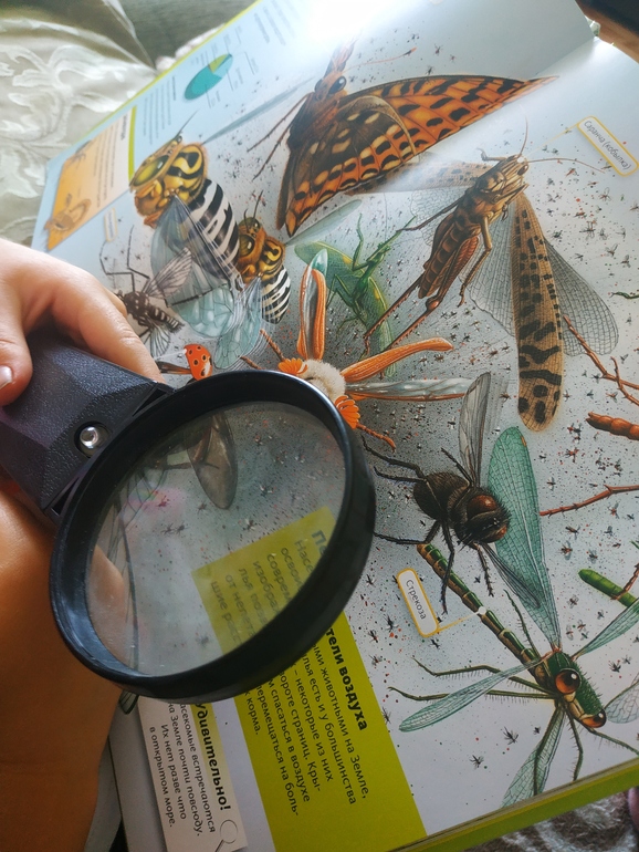 Дочка добралась до книги про насекомых. Очередной раз убеждаюсь, что ребенок сам найдет что почитать, даже если шрифт мелкий.