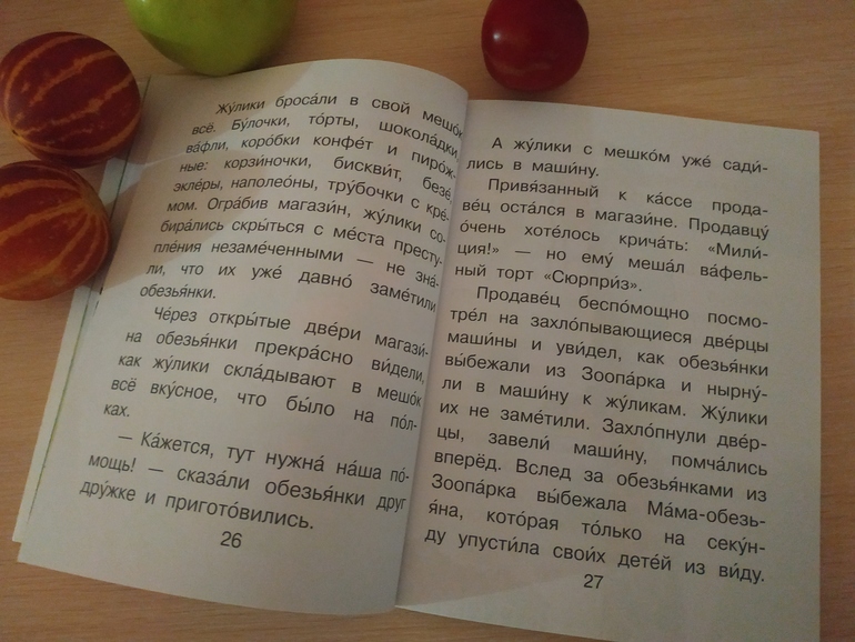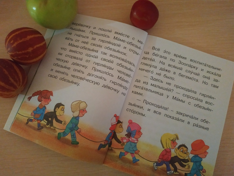 И в этом месяце произошел прорыв в чтении у дочки. А началось всё с прогулки. Увидев в ларьке книгу про любимых обезьянок, дочка просила купить её. Но я, осмотрев книгу, решила, что не осилит дочка текст на два разворота без картинок. В итоге дочка уговорила купить. И ведь прочитала сама!!
