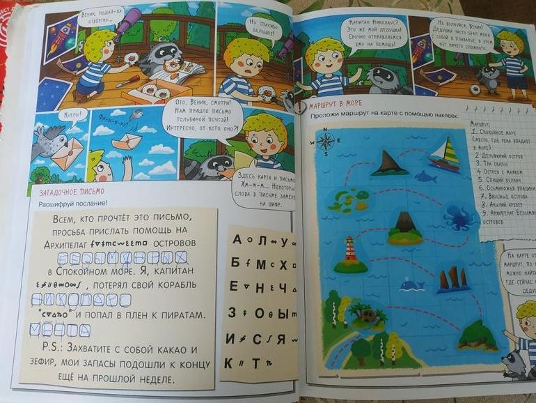 В самолет взяли книги, чтобы скоротать долгий перелёт. Хорошая серия книг. Тут и наклейки и лабиринты и шифр. Комикс дочка читала самостоятельно.