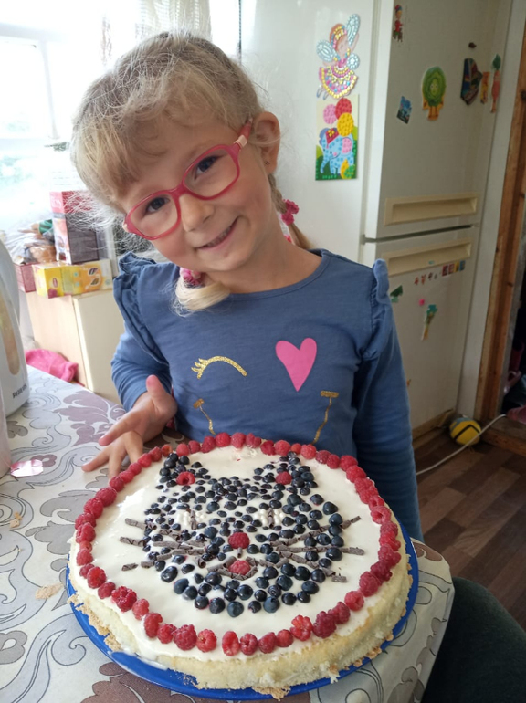 Мы с Лизой украшали торт. Чернику дети сами в лесу собирали.