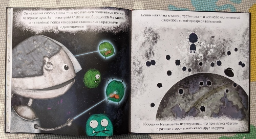 Познакомились с роботами, хочу еще что-то на эту тему, где рассказывается из чего состоит робот. Что-то более о механике. А сама история тут очень милая) Монстрики с зелеными попками это нечто, но для деток, которые легко пугаются всяких злых героев просто супер идея.